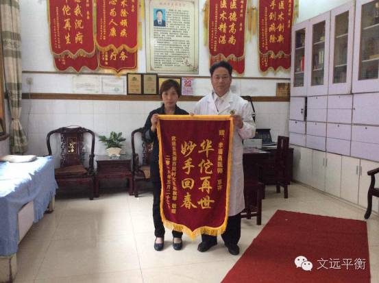 患者为了表达感恩之心,于今年5月22日怀着十分高兴的喜悦,特地赠我一面锦旗,上面写着:华佗再世、妙手回春。并与我合影留念,我也非常感动,我只能说:尽到自己一个医生的责任,病人就给我这么高的评价,我首先要感谢恩师王文远教授对我的栽培,我要继续努力学习,平衡针灸,虚心好学,更好地为百姓解决痛苦。