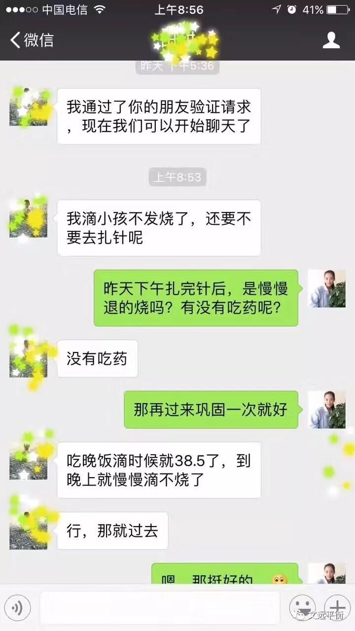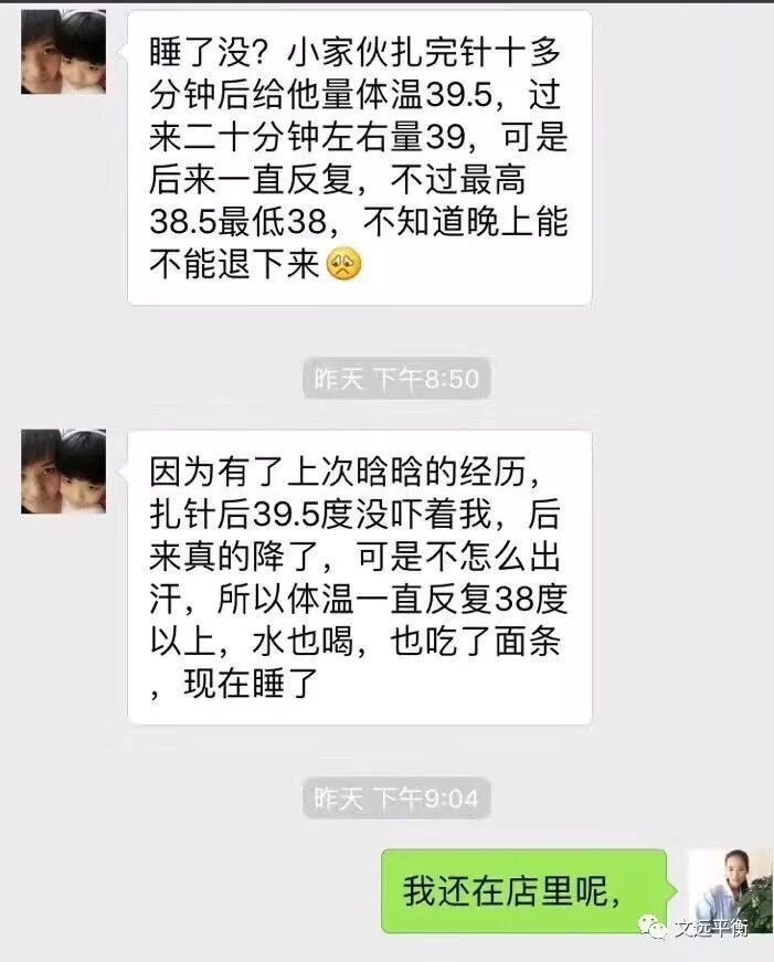 不到30分钟,孩子体温降至38.5°C!治疗后一个小时时体温降至38°C!见孩子体温下来了,便嘱咐孩子妈妈:“晚上回去给孩子喝点粥,增加营养与能量,帮助排汗!”