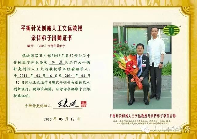 2014年李罡医师在第五届平衡针灸国际大会上荣获平衡针灸国际名医称号,2015年李罡成为中国平衡针灸史上第一批出师弟子(全国共12名),深得恩师王文远教授的厚爱和真传,并在第六届平衡针灸国际大会上荣获平衡针灸特殊人才奖。