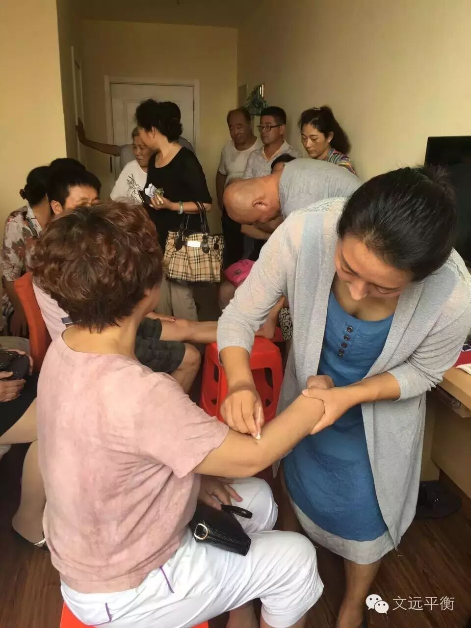 几经寒暄问候,我把平衡针灸的保健箱,及准备工作就绪后就开始了义诊。这一开始不曾想就有了照片中的场景,在通过一边治疗,一边针对每位患者进行心理疏导,和面诊后,屋子里越来越多的惊呼声此起彼伏,几乎每一位的脾气,生活习气,等等让患者认为不可能的事情被我说出,他(她)彻底的折服了,小小的银针,飞快的在每位患者的身体个个对应平衡靶点进行针刺后,一个个让在场满屋子的人不可思议的一幕幕出现了,无论是由于腰椎病痛被搀扶进来的老者,还是面部神经痉挛的女性,到被长时间病痛折磨的颈肩病等症状,手抖个不停的患者,都出现了让他们惊讶的现象,所有的人脸上都露出了惊奇的喜悦,手不抖了,面部抽动停止了,弯着腰的老者也半信半疑的直起了腰,左三圈右三圈,脖子扭扭,屁股扭扭像在跳舞,开始的病痛症状消失了!