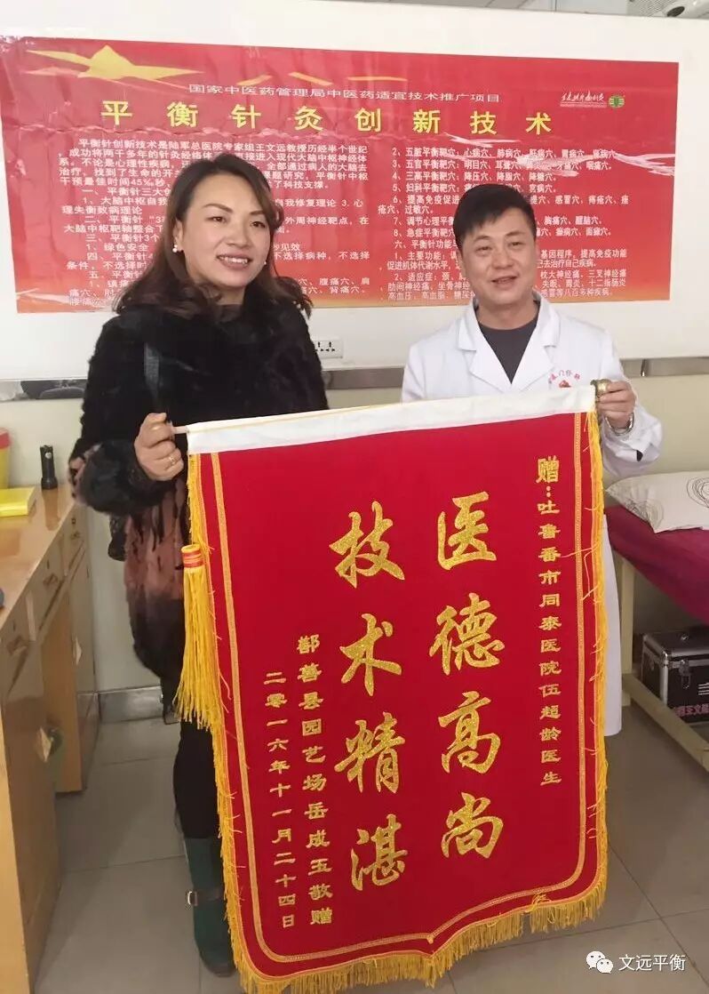 事迹二:维族买力克汗,女,66岁,眼底黄斑一年多,看别人时,人家脸面部器官分不清楚,且越来越严重。曾在全国多家三甲医院都治疗无效果,并被告知这个病是世界性疑难杂症,治不好,只能吃药慢慢控制。听邻居说平衡针效果挺好,就抱着一点点希望来接受平衡针治疗。买力克汗说:〝当伍医生告诉我这个病可以治,说我这病是年轻时生气造成的,影响了心脏供血,导致大脑供血不足,影响了管控眼睛供血系统。经过平衡针两个多月的治疗,我现在什么都能看清楚了,而且我的白头发都变黑了,手臂上的汗毛也长出来了,今天我是特意来感谢平衡针,麻烦徐医生你替我向你们的师父王文远教授问好和感谢!我现在天天都在给我的朋友宣传平衡针,我女婿是吐鲁番市高昌区区长,我会让他了解平衡针支持平衡针的。平衡针给我们新疆吐鲁番患者带来了福音,希望下次邀请你们师父来吐鲁番做客。我表示一定把吐鲁番人民对师父王文远教授的邀请、期盼、感恩带给师父。