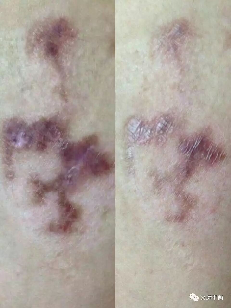 洛阳谢师兄发表了面部色素主要成因的看法,主因是情绪使然,易着急生气破坏了人体免疫、消化、内分泌等几大系统正常功能,也揭示了皮神经微循环不良,心脑血管供血相对不足等问题,体内毒素不能通过毛孔排出体外,导致黑色素沉着。通过针刺头三针、心病穴、肩痛穴等,使上述不足都得到相应改善,以达健康美容之功效。郴州曹师姐治疗过下巴和额头缝针疤痕完全消失的病例,也治疗过小腿多年烫伤褐色疤痕意外变淡的病例,两个月前后的效果对比明显: