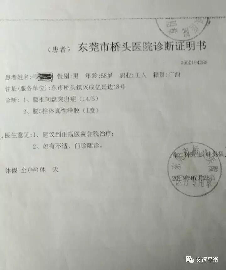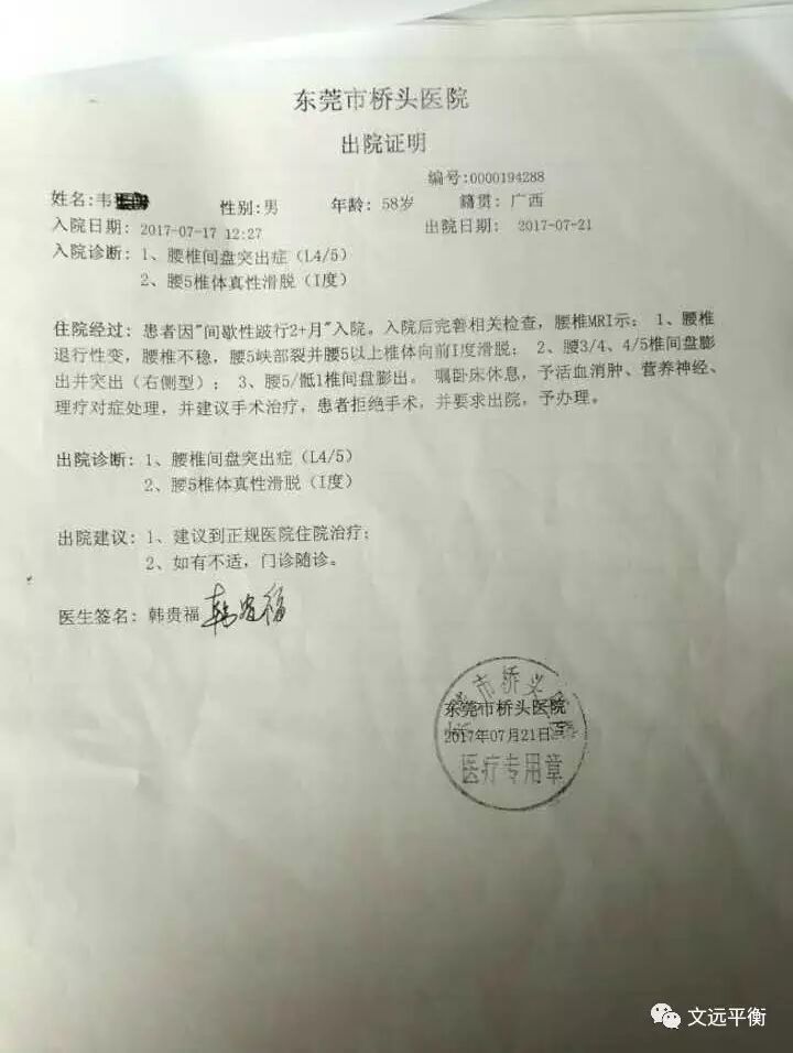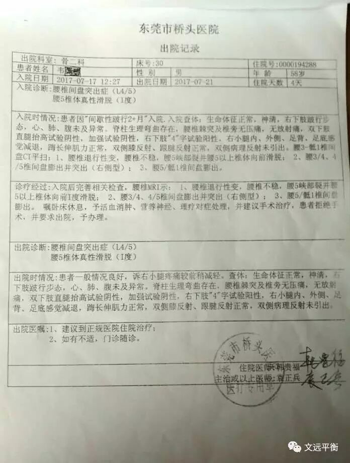 2017年7月21日患者的孙女因为支气管炎咳嗽,我到患者的家中进行干预。患者的的儿子是我六七年的老客户,从谈恋爱到结婚生子一直健康都是我给予保健呵护,小孩子从出生几乎不吃药,不打针就用中医手法呵护。当时他很着急的问我:“冯姐,您师父有没有好办法治疗椎间盘突出和腰椎滑脱”。我告诉他:“有,关于腰椎间盘突出症以及治疗方法是重点,教授以及三个老师用了二三天专讲这个病的病因,病理,以及如何治愈”。是谁?您这么着急?他告诉我是他的父亲,现在人在东莞,医院要求手术,弟弟已经过去广东陪爸爸准备做手术了,我不想手术,所以想问我有没有好办法!由于是至信任的朋友,他本人也是西医的牙科医生。我直接告诉他,手术的副作用是:应激性的手术创伤会远远超过没有手术前的疼痛,麻药对神经的损害不能不重视,我的当门牙,是您帮我做的手术,我下锷部麻木了三年。最重要的手术风险谁都没有百分百的把喔,平衡针灸安全,您自己和您孩子的疗效已经证实了,我认为我们先用中医保守治疗,无效在选择手术,给予自己一个机会,也给予我一个机会。他告诉我,现在手术费用,押金已经交了,不知道可不可以退,他爸爸现在的情况很严重,走不了路,疼,蹲不了,已经无法自理。手术要几万元,住院要至少21天。还需要人护理照顾。然后他马上打电话给予弟弟问医生,然后拒绝做手术,直出院,连夜赶回来到钦州,2017年的7月22号凌晨5点多,他和他弟弟到气车站把老爸背回家中,7点50才给予我打电话。