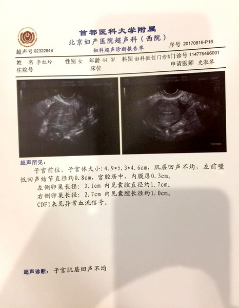 1.8现病史:北京妇产医院超声检查右侧囊性回声见4.7cm*3.9cm*3.6cm,见子囊长约2.0cm。