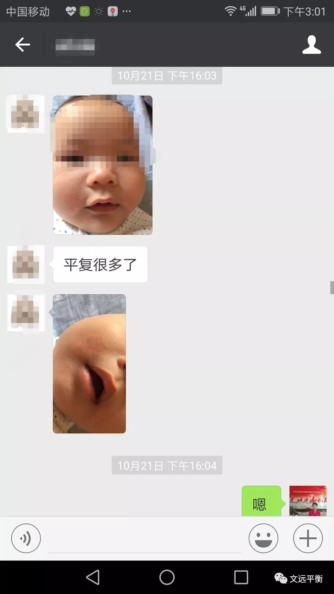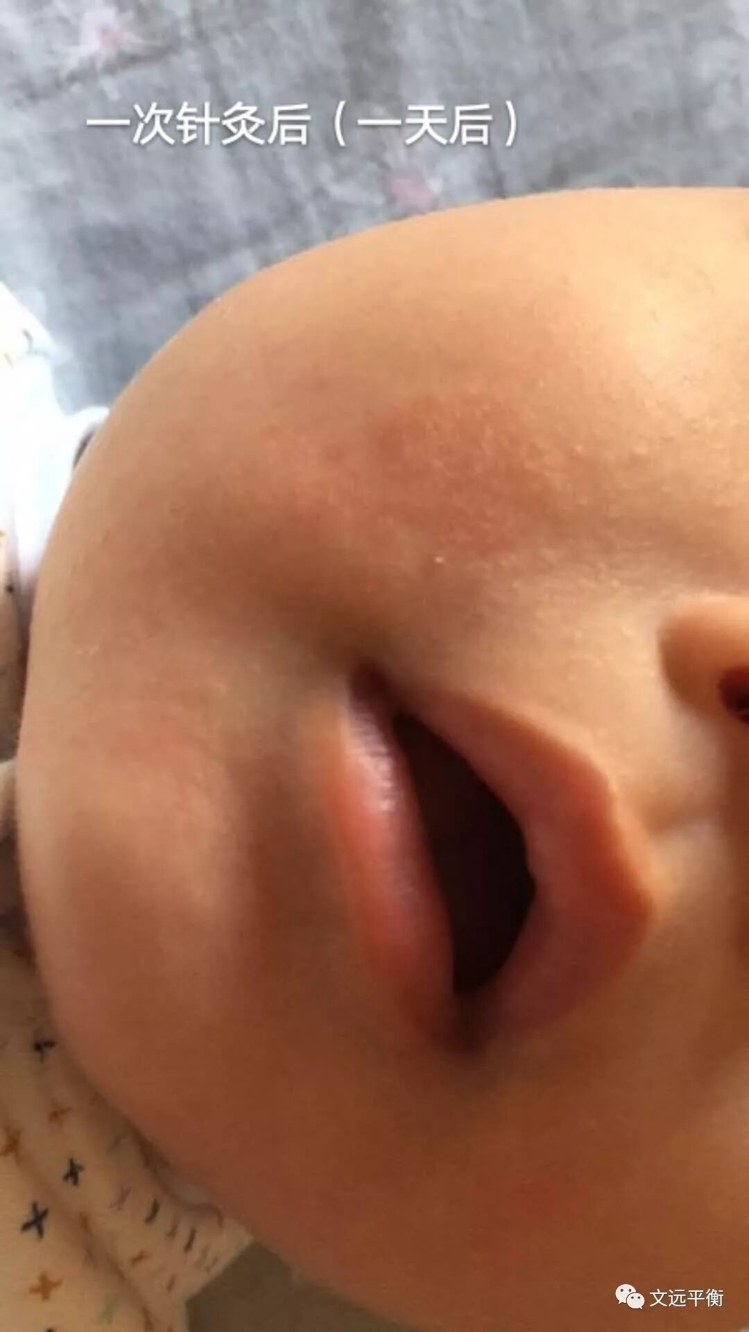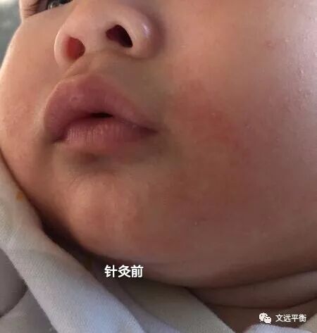该患儿可以说是平衡针宝宝,他的母亲从孕前、孕期、产后,都扎平衡针灸做保健,小宝在出生19天时扎了第一次平衡飞针,由于初生脐带出血,在医院打针吃药效果不佳。后其母亲告知我,采用平衡针,两天就痊愈;这次小宝宝面部湿疹,其母就主动带小宝宝来扎针。