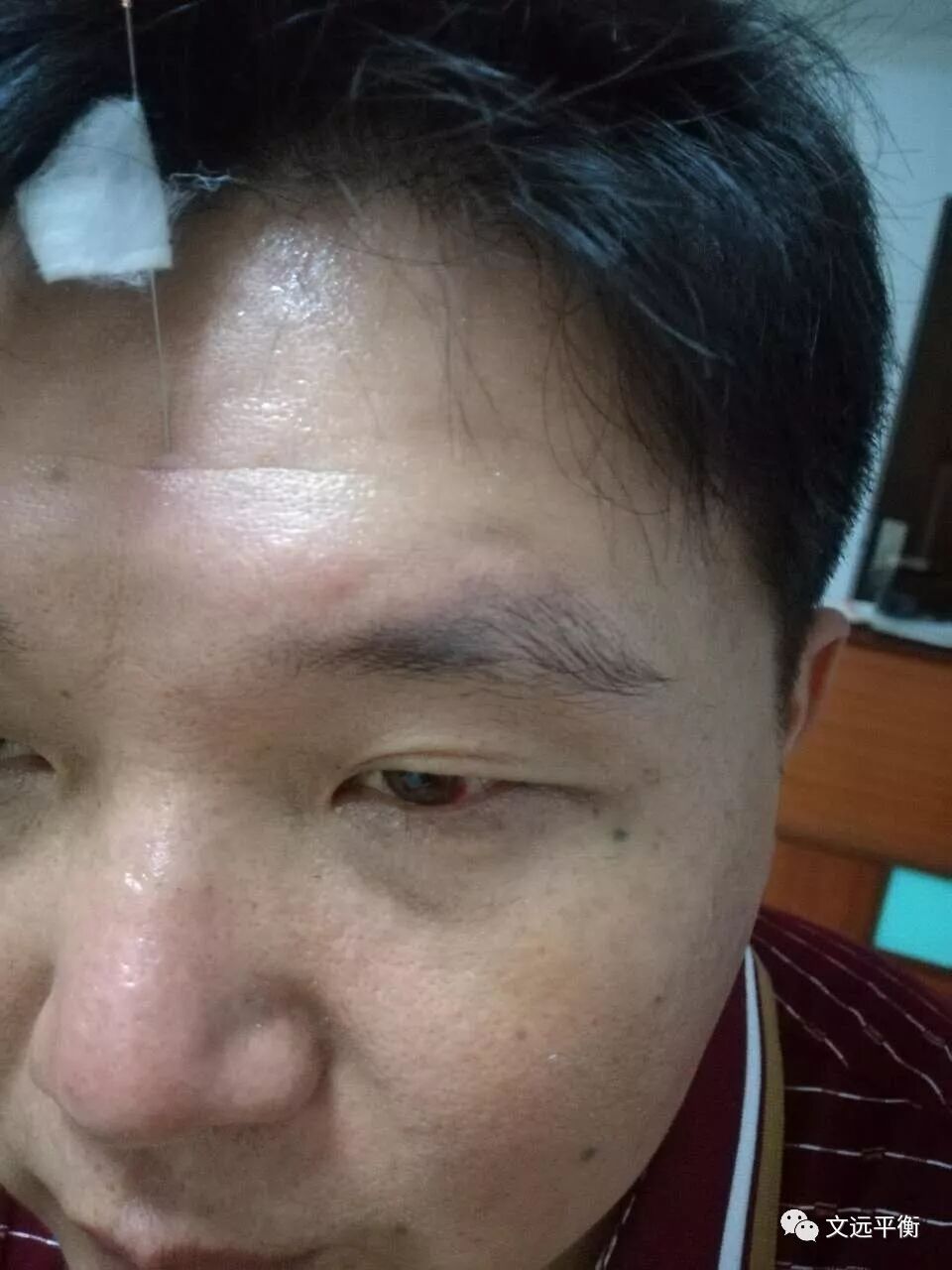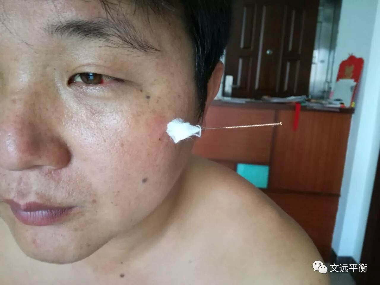 第三天,他来时说:头痛、头晕,要比昨天好些,早上起床,睁眼时,眼睑仍有分泌物,不能睁开,清洗分泌物后,眼睑可以睁开一些,有光感,睁眼能看眼外模糊东西,咽部咯出少许暗红色血粘痰,今除头痛、眼痛、颈部、臀部不适外,其他身体部位没有明显不适。给他简单查体:在前额及鼻部处压痛,左眼周肿胀及淤紫稍好一些,眼睑可以睁开约0.3CM及闭合, 用手掰开眼睑,见眼结膜淤血及一伤口,伤口无渗血,已开始愈合,双侧瞳孔等圆等大,直径约3mm,对光反应灵敏。鼻腔稍红肿,压痛,无见鼻液分泌物。口耳无见异常。颈软,颈部稍肿,压痛,无颈项强直。胸腹未见明显异常。左侧臀部稍肿,压痛。根据病情,让他停用眼药水,甲钴胺片可以继续服用。依病情平衡针干预靶点:头痛靶点、腕痛靶点、鼻炎靶点、肺病靶点。针后,他说疼痛减轻,人较前顺畅。