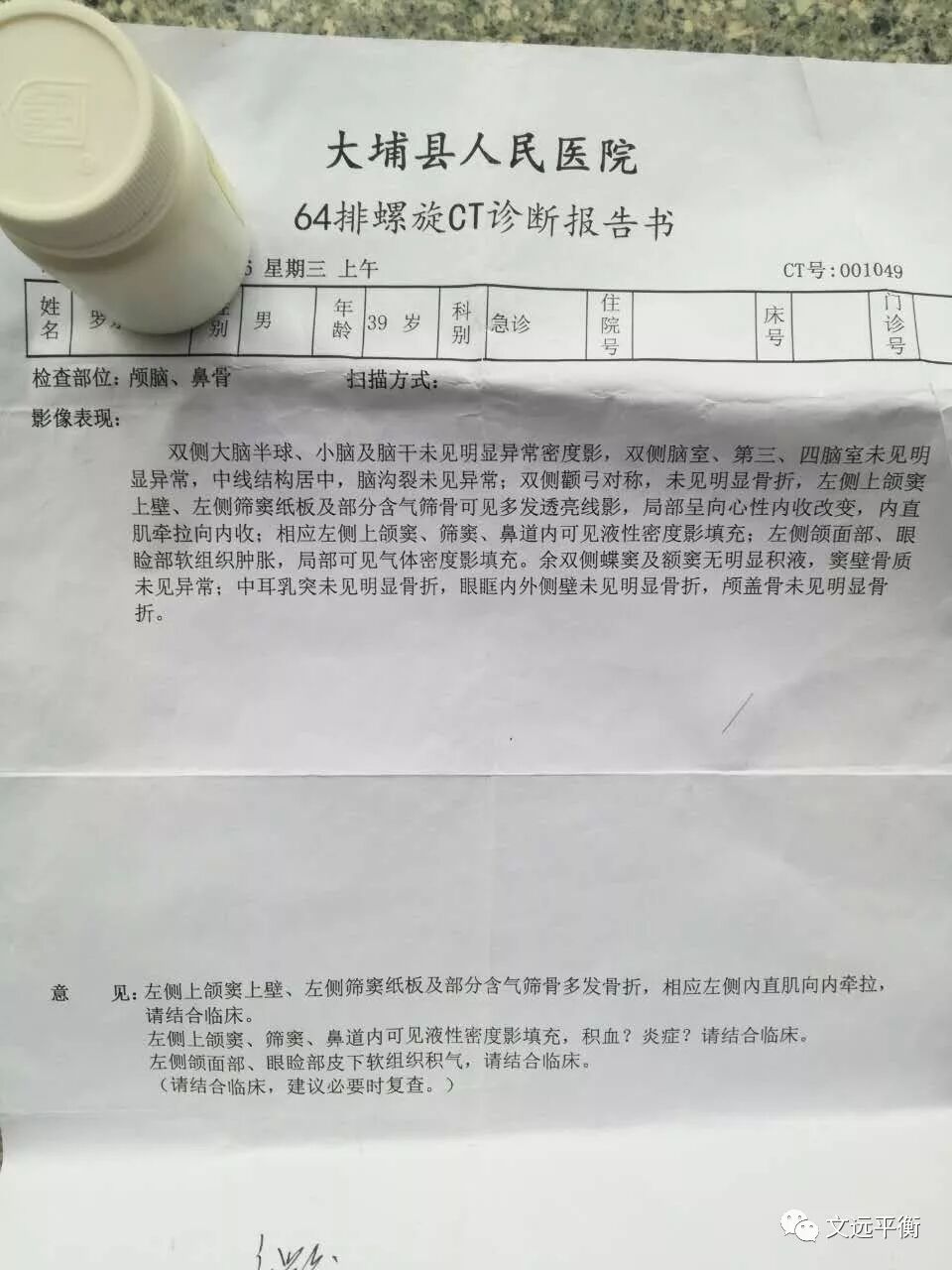 县医院CT检查结果示:1、左侧上颌窦上壁、左侧筛窦纸板及部分含气筛骨多发骨折,相应左侧内直肌向内牵拉。2、左侧上颌窦、筛窦、鼻道內可见液性密度影填充,积血?炎症?3、左侧颌面部、眼睑部皮下软组织积气。