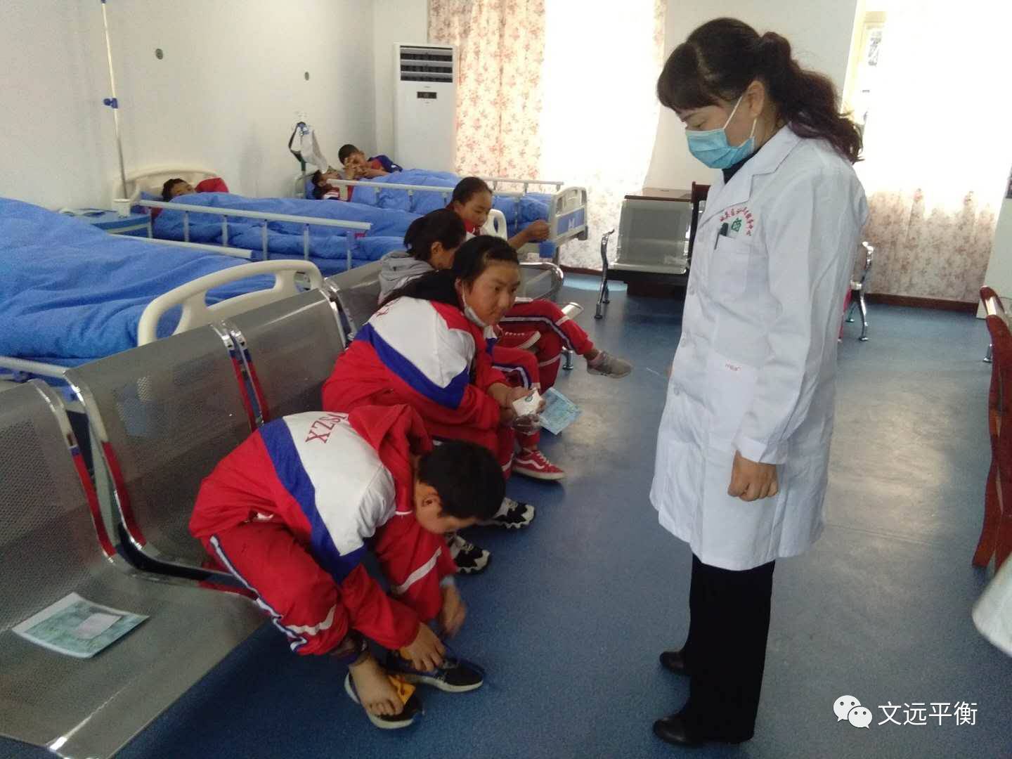 图为城关区平衡针灸爱心团队队长、卫计委主任唐小君给学生进行平衡针灸干预