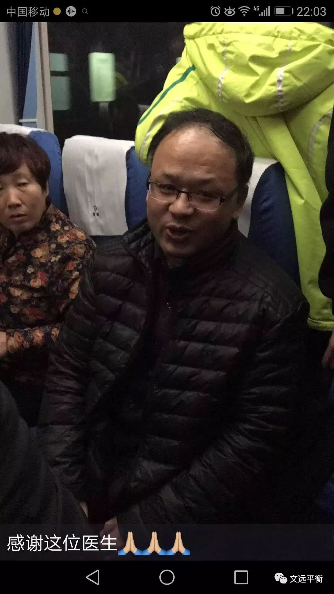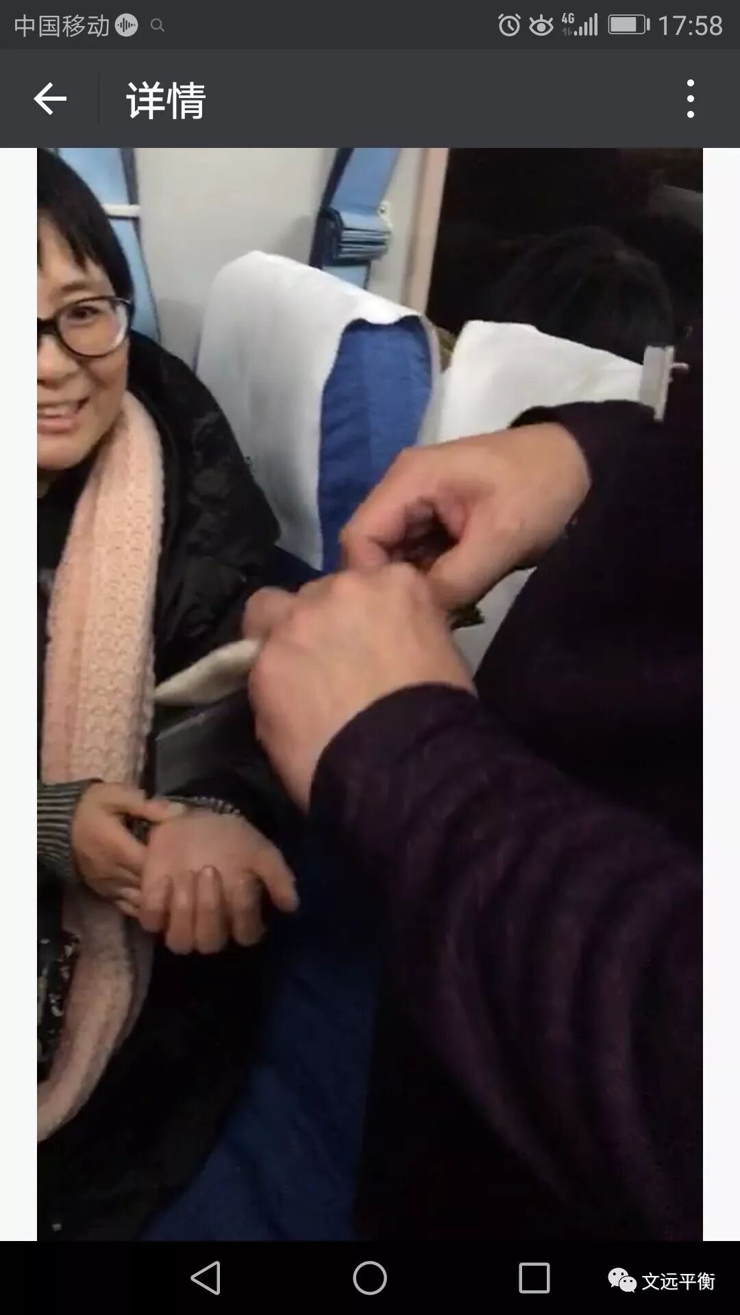 2017年12月27日,上午在陆军总医院北京王文远教授平衡针灸师承门诊见习结束后,下午我踏上了北京至邯郸的T9次回家的列车,列车风驰电挚,此时的我思绪万千,脑海中浮现出恩师上午在师承工作室示教的一幕幕……,恩师的话语萦绕在耳边,自己以前在临床疑惑迎刃而解,思路也越来越清晰,食如甘饴的感觉沁入心脾!时间过得真快,不知不觉已快到邯郸,这时我发现邻坐的一女子(大约有35岁左右)在给另外一个小姑娘(大约有20岁左右)按揉颈椎,出于职业习惯,我便起身站到了她们旁边,她们看了看我,然后凑近我又看了看,问:“您是专门研究针灸的?”哦,她们是看到了我佩戴的【北京平衡针灸研究院】的胸牌,“啊,是的”我笑了笑对她们说:“我今天刚参加完平衡针灸创始人王文远教授的师承门诊见习,现在回家”,小姑娘看看我:“那我颈椎痛能治吗?”,因为列车快到站了,于是我直接说:“你怕扎针吗,如果不怕,我给你扎一针,只需要三秒钟”,“不怕”,我从随身的挎包里拿出酒精药棉和一次性针灸针在她左手的颈痛穴扎了一针,“咦,奇怪,我脖子右边现在突然一下子轻松了,左边还有点难受”,于是我在她的右手上又扎了针“太神了,我两边都不痛了,好舒服,谢谢,我今天是遇到好人了”,这时刚给她做按揉的女子说:“我左手腕痛有一段时间了,也可以治吗?”我说:“没问题”接着我在她右手腕扎了一针,症状瞬间消失,这时列车到站了,同车旅客看到后有人找我治疗,但时间已然来不及了,匆忙中留下电话,就下车了。