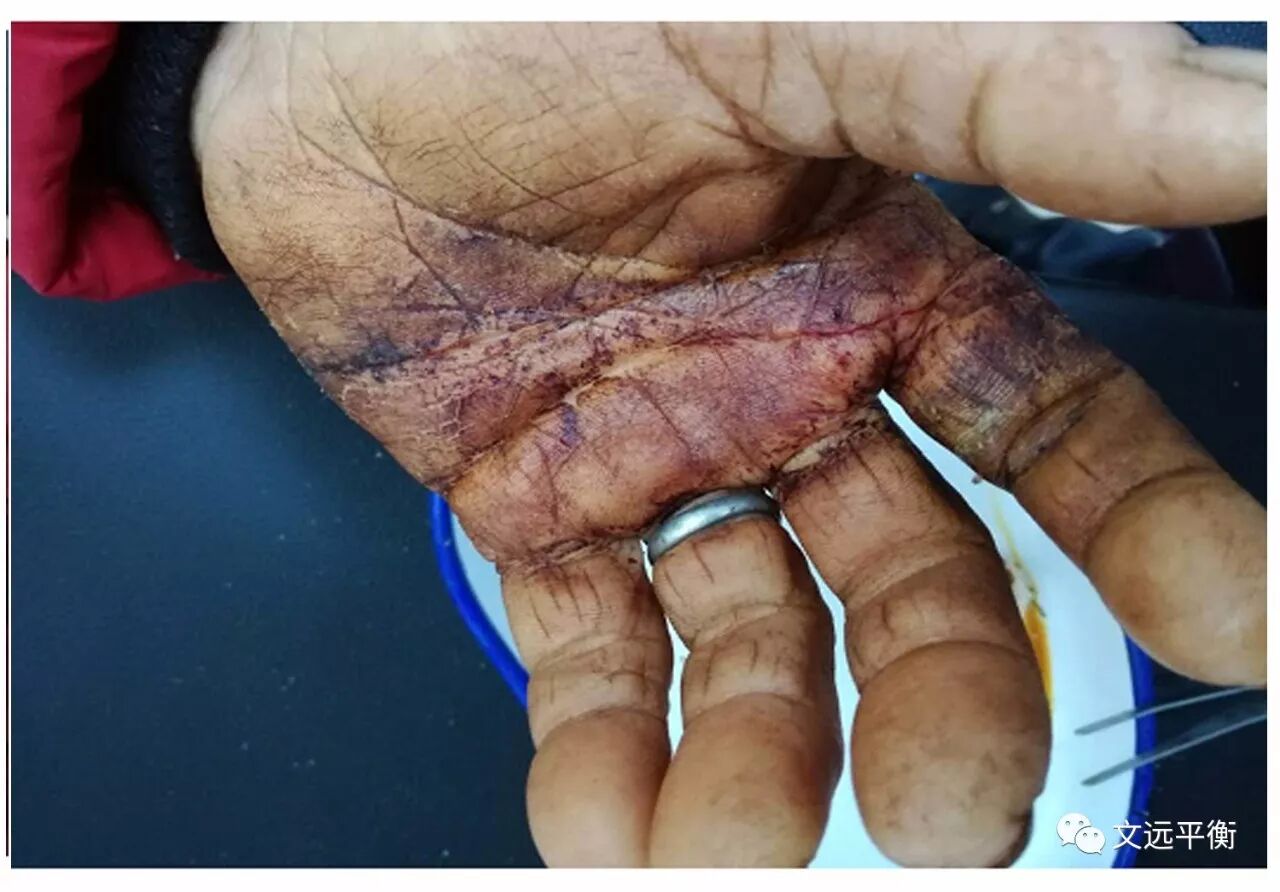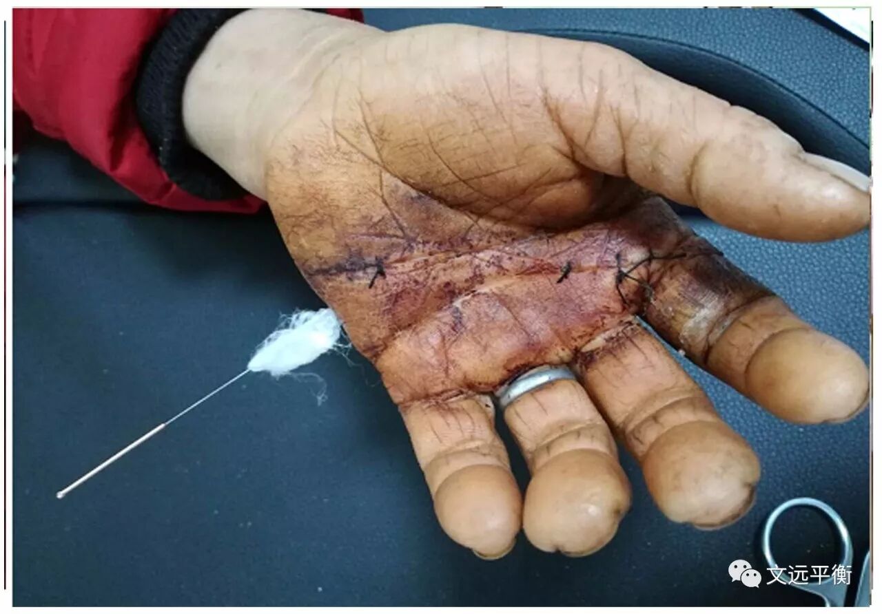 第六天她来治疗时,问她回去后感受如何?她说回去后手掌没有那么痛了,手掌活动较前舒适很多,可用左手配合右手一起协助做一些家务活。让她到手术室换药,见左手掌和伤口不肿,伤口没有渗分泌物、结痂,已拆线伤口愈合的蛮好,按压伤口,不是感觉很痛,给以消毒,然把剩余的线拆完。让她缓慢伸展和收缩手掌,伤口皮肤没有裂开。然取平衡针靶点:咽痛靶点、指麻靶点治疗。问她感受如何?,她说针刺处有麻胀痛感觉,伤口处没有牵拉痛了。交代患者保洁伤口,暂时不能用手去干重活。以后如没有不适不用过来继续治疗。