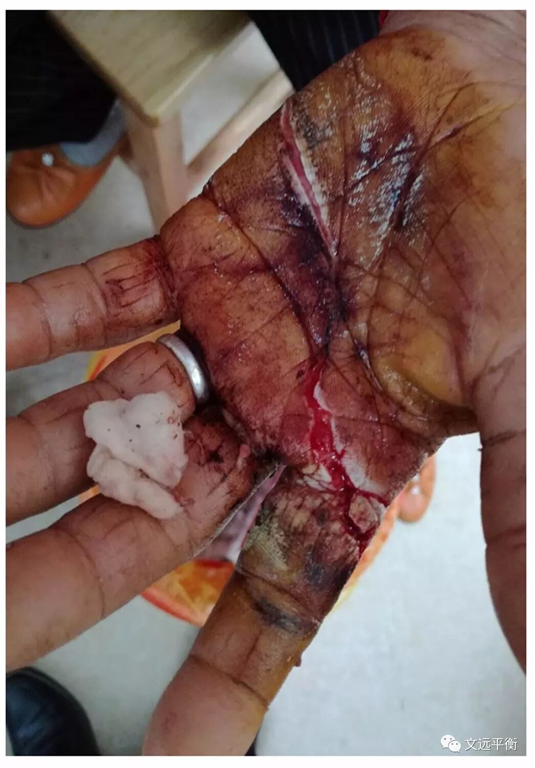 查:神志清,痛苦面容,检查合作,对答切题,面色稍白,口唇无发绀,双瞳孔等圆等大,对光反应灵敏,伸舌居中,颈软,气管居中,心、肺检查未见明显异常。腹部平软,肝脾未及,无压痛及反跳痛,肾区无叩痛。四肢肌力、肌张力正常,病理症未引出。左手掌发现2处皮肤裂伤,在掌处连接食指根部见一处约0.5X3.5cm裂开伤口,伤口少许溢血,压痛。在掌中见一处约0.3X3cm裂开伤口,伤口少许溢血,压痛。余未见明显异常。