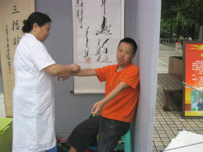 义诊结束后,患儿自费继续接受治疗,已经3年左右,每周1-2次,患儿各方面都进步很大,桶状胸全部正常,心尖区波动状完全消失,胆质反流性胃炎基本未发作。特别是语言障碍改变了很多。可以说出一些较简单的语言,他给我说:“放学了,老师,我回家了,再见,”,“谢谢婆婆王医生,针炙治好我的病,谢谢婆婆”,除一些简单说话外,还可以自理一些简单的生活,患儿每次来扎针时都和我握手、拥抱。看到此境我非常心慰。