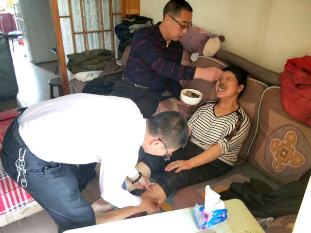 后来,在3月11日下午,我们相约在成都市金牛区金周路喝茶,其他朋友纷纷前来找我扎针:“杨医生,你的平衡针很厉害,上次我扎了针,颈椎一点不痛了,舒服多了,今天再给我扎一次。”“杨医生,你上次给我扎了针,腰不痛了,这几天下雨受寒又疼了,能不能再给我扎一针?"就这样,你一针、我一针、他一针,杨兆文先生这才开始重视,亲眼见证了我扎针的疗效。说着说着就提到了他的妻子涂女士,杨先生给我讲述了她妻子发病、治病的过程,在朋友劝说下,杨先生把我带到了他成都的家。我看到她的妻子躺在床上,了解了病情后给她第一次扎了平衡针。