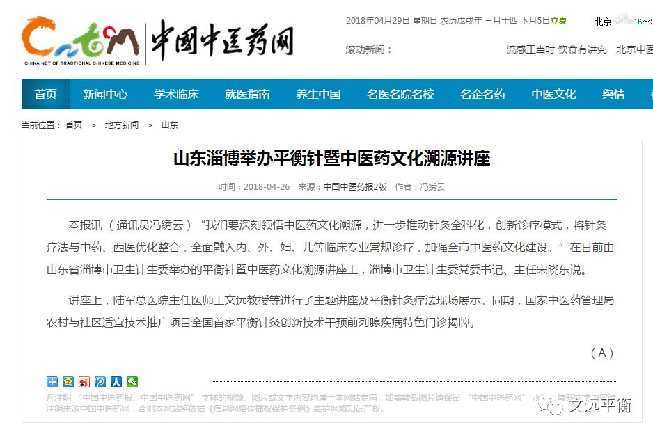 本报讯 (通讯员冯绣云)“我们要深刻领悟中医药文化溯源,进一步推动针灸全科化,创新诊疗模式,将针灸疗法与中药、西医优化整合,全面融入内、外、妇、儿等临床专业常规诊疗,加强全市中医药文化建设。”在日前由山东省淄博市卫生计生委举办的平衡针暨中医药文化溯源讲座上,淄博市卫生计生委党委书记、主任宋晓东说。