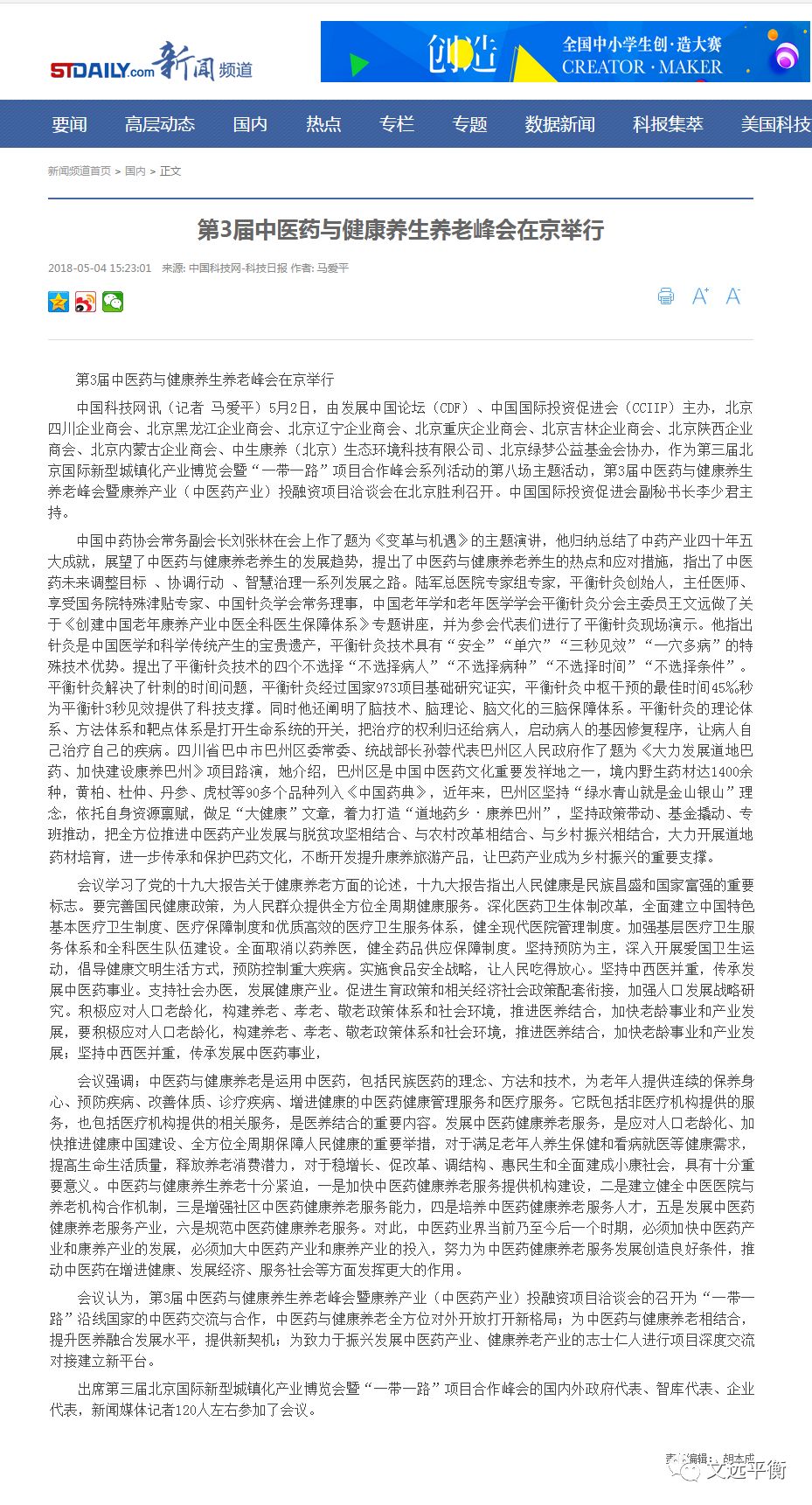 中国科技网讯(记者 马爱平)5月2日,由发展中国论坛(CDF)、中国国际投资促进会(CCIIP)主办,北京四川企业商会、北京黑龙江企业商会、北京辽宁企业商会、北京重庆企业商会、北京吉林企业商会、北京陕西企业商会、北京内蒙古企业商会、中生康养(北京)生态环境科技有限公司、北京绿梦公益基金会协办,作为第三届北京国际新型城镇化产业博览会暨“一带一路”项目合作峰会系列活动的第八场主题活动,第3届中医药与健康养生养老峰会暨康养产业(中医药产业)投融资项目洽谈会在北京胜利召开。中国国际投资促进会副秘书长李少君主持。