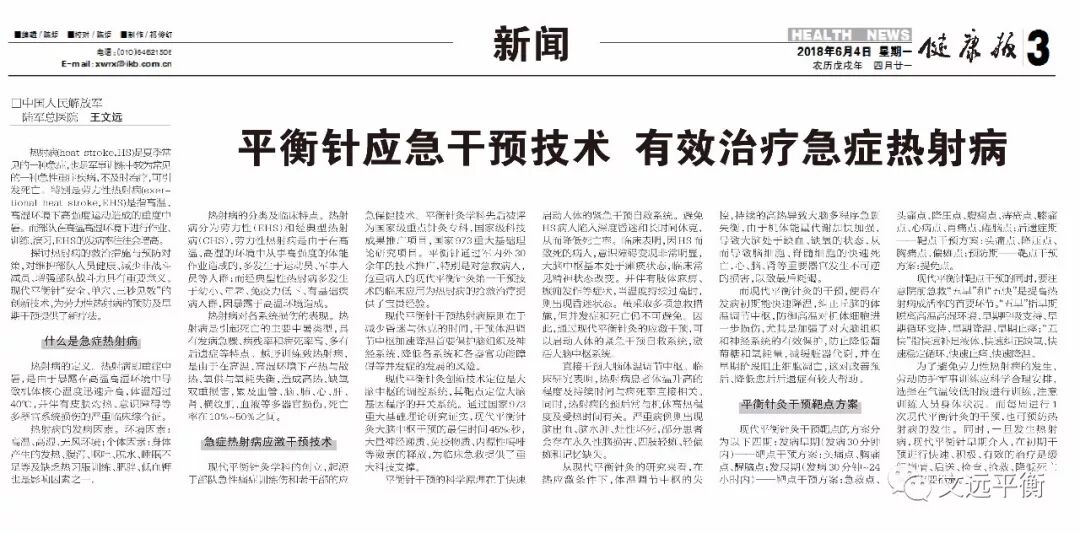 探讨热射病的救治措施与预防对策,对维护部队人员健康、减少非战斗减员、增强部队战斗力具有重要意义。现代平衡针“安全、单穴、三秒见效”的创新技术,为劳力性热射病的预防及早期干预提供了新疗法。