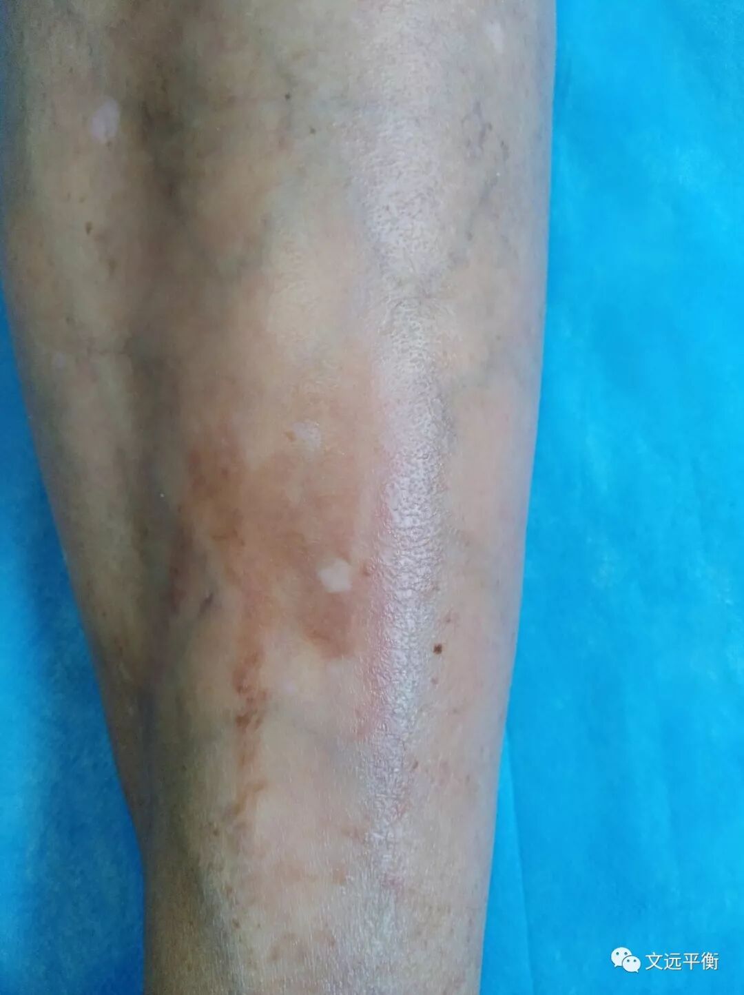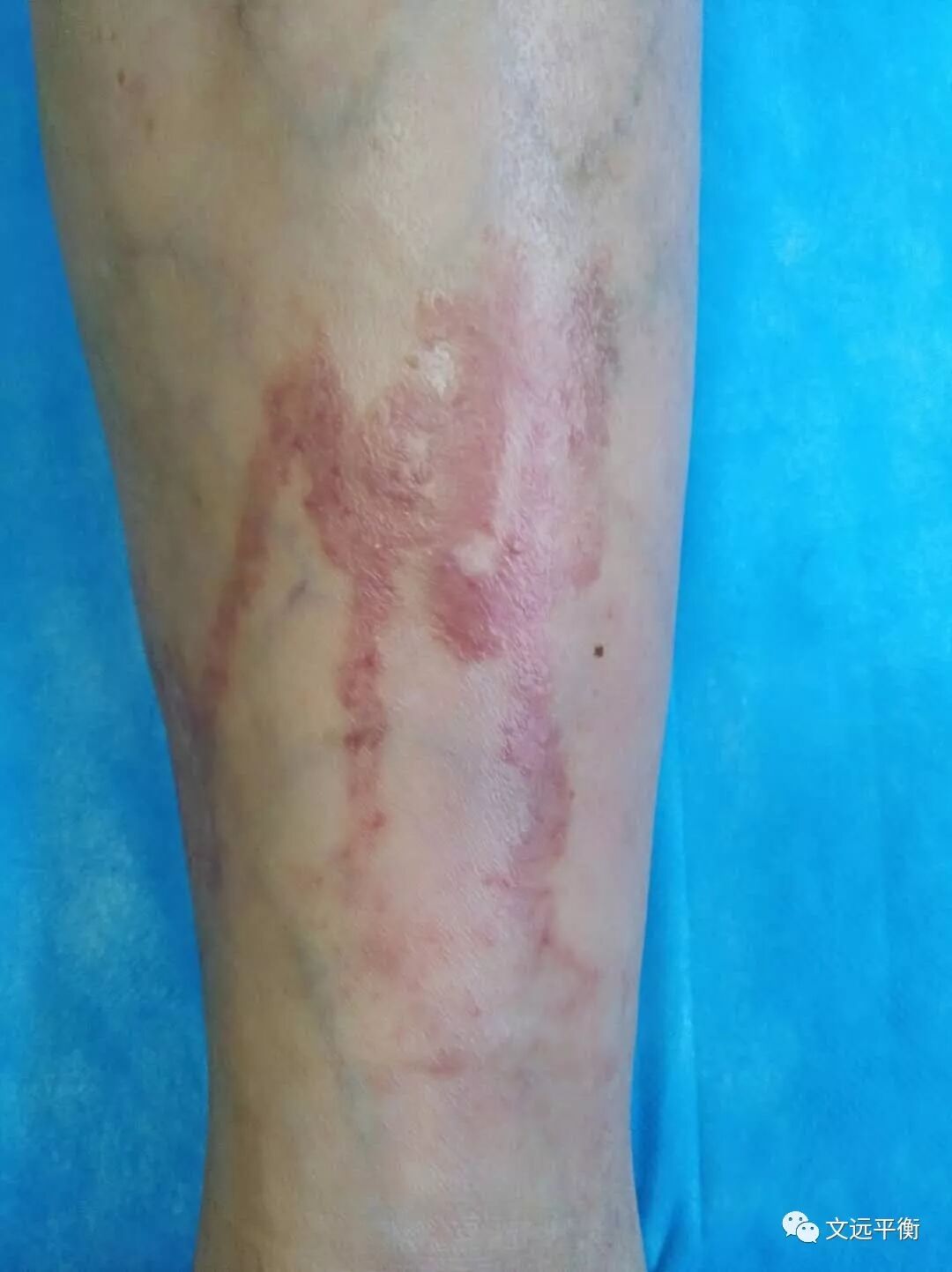 昨天左踝关节内侧上10厘米处发痒,今天踝横纹上10厘米处出现一片红色丘疹。