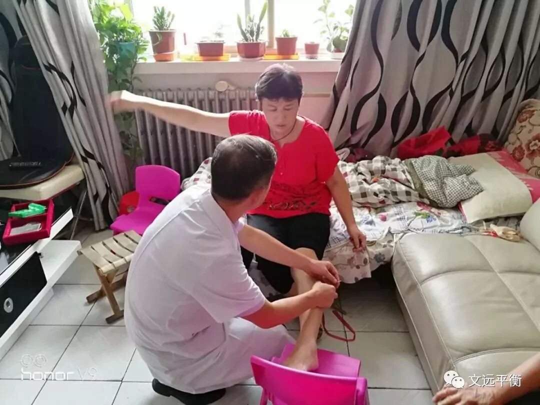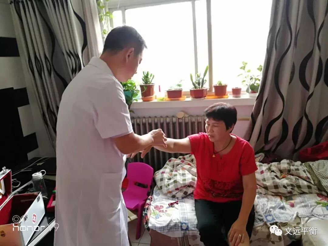 在贫困户赵存芳家中,志愿者们和赵存芳亲切交谈,得知赵存芳有手脚麻木的病症后,雷安忠随即为其针灸治疗。短短几秒钟,赵存芳原本抬不起的胳膊已经能抬到肩膀了。