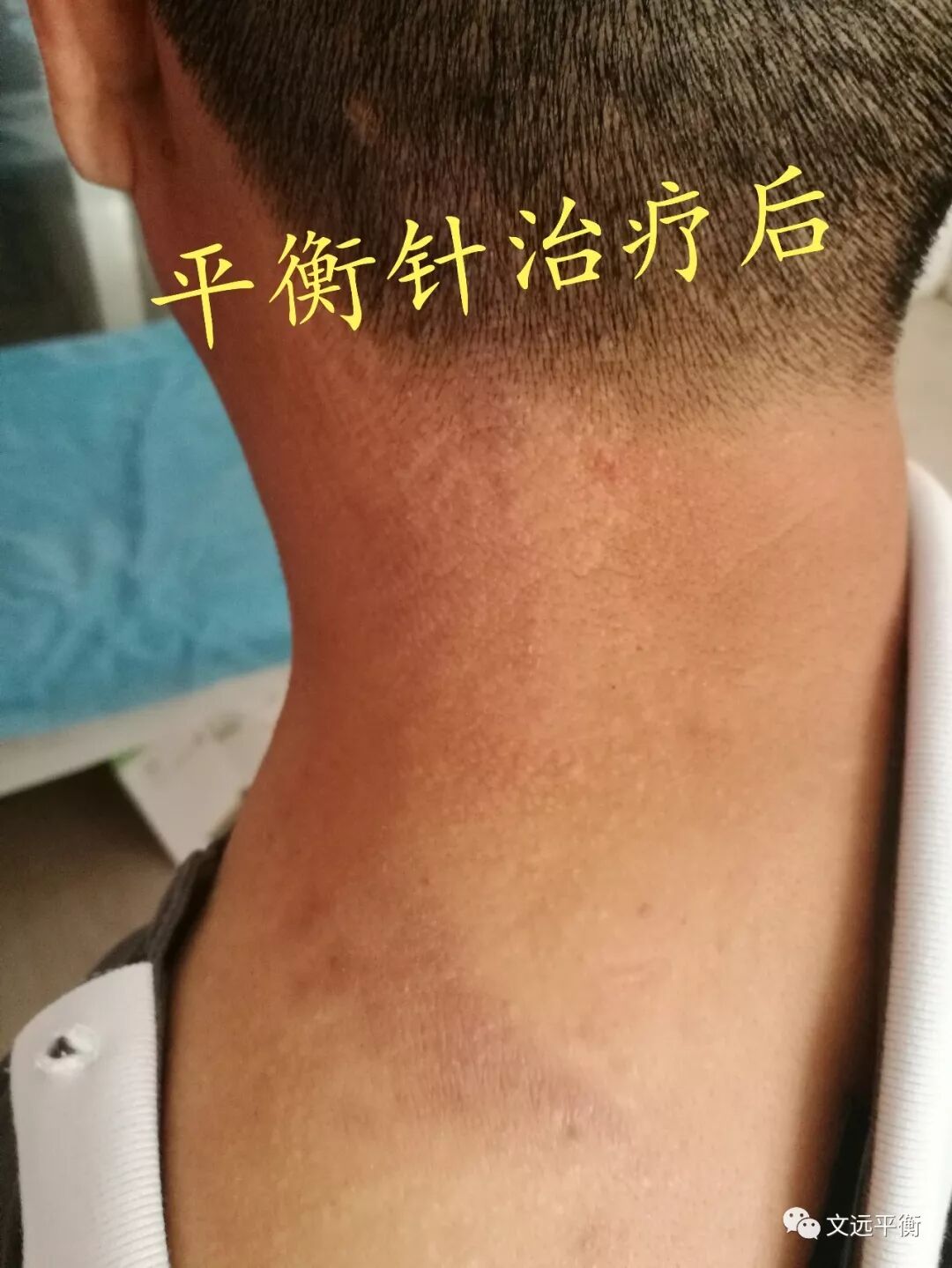 患者第一次治疗完毕,颈部及双肘部瘙痒迅速减轻。第四次治疗,患者诉偶尔会出现瘙痒,查左侧颈部皮炎部位的皮肤平坦,几乎无隆起,颜色变淡,麟宵减少;双肘部皮疹减少,颜色接近周围皮肤。未出现头晕烦躁等。第十次治疗,患者诉几乎未出现瘙痒,查颈部皮肤较光滑,颜色接近周围正常皮肤,双肘部皮疹稀少。第十八次治疗,神经性皮炎部位皮肤已接近皮肤。随访两个月,未见复发。