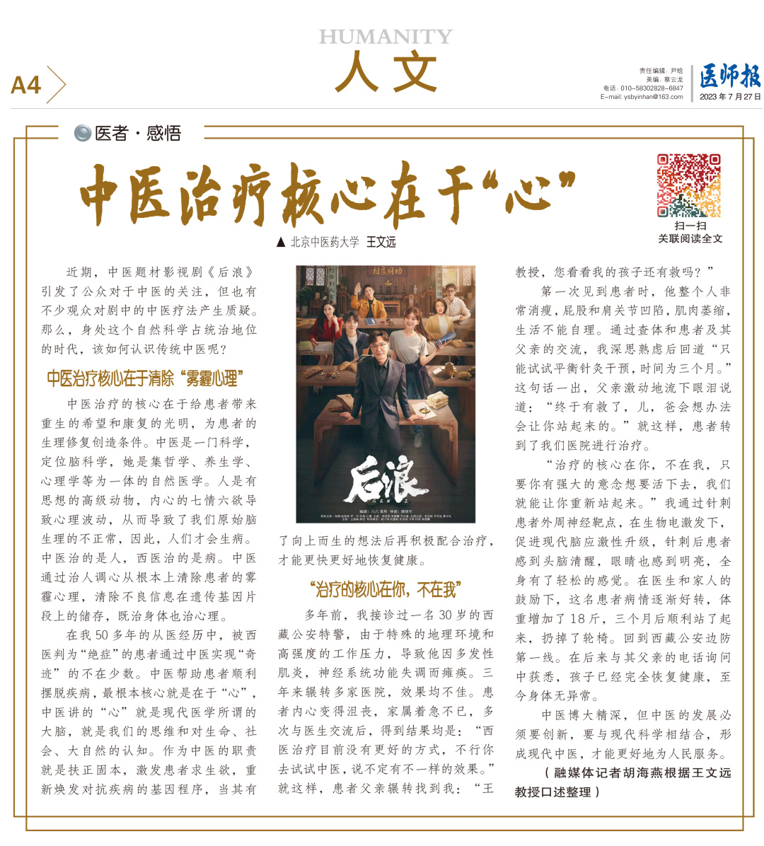 近期,中医题材影视剧《后浪》 引发了公众对于中医的关注,但也有 不少观众对剧中的中医疗法产生质疑。 那么,身处这个自然科学占统治地位 的时代,该如何认识传统中医呢?