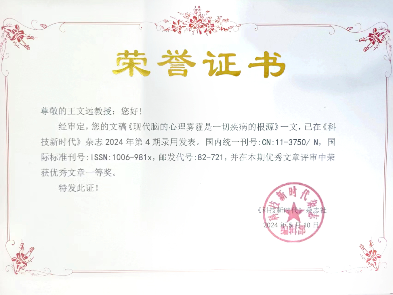 探索生命科学奥秘,首先要明白人为什么会生病?生大病?为什 么百岁老人只占人口的十万分之一,绝大部分人都活不到自然寿命, 甚至年纪轻轻就提前走完人生路。2500 年前的《黄帝内经》给出了答案, 中医认为致病的因素有内因,外因,不内外因。内因就是“七情”—喜、 怒、忧、思、悲、恐、惊,外因就是“六淫”—风、寒、暑、湿、燥、 火。外因通过内因而发病。不内外因就是饮食不慎,劳倦太过、生活 失节,跌打损伤和不可抗拒的天灾等。内因是核心,外因通过内因而 起作用。“七情”反映的是人的情绪,人的精神,是人的心理的外在 表现。七情过极,心理雾霾严重了,必然会引发心理与生理的各种疾病。 《黄帝内经》提出“气生百病”。这个气指的就是“七情”,就是我 们心理活动。通过对百岁老人的调查,发现唯一一个共同的规律是长 寿老人普遍拥有积极向上的心态,他们乐观、自信,对生活充满热情。 这种积极的心态有助于他们面对生活中的困难和压力,从而降低心理 负担。此外,积极的心态还能提高免疫力,使人体更加健康。 从脑科学研究看,我们的大脑是由现代脑和原始脑共同组成,大脑 是遗传基因程序的载体。现代脑是以心理学为核心,代表我们的心理、 情感、信仰、文字、大爱等,以爱的奉献为核心,主要体现心理遗传 基因程序;原始脑是以生理学为核心,代表我们的生理,是低级动物 的本能,原始脑体现生理遗传基因程序;现代脑和原始脑相互共存, 相互影响,现代大脑是否正常直接决定我们的原始脑是否正常。心理 健康决定生理健康,生理健康影响心理健康,只有心理健康了我们的 生理才会健康。心理雾霾反映了现代脑的认知失调,当雾霾心理反复 超过现代脑的心理承受阈值,必然会干扰原始脑的生理调节功能,造 成免疫功能降低,神经指挥系统功能紊乱,内分泌失调,从而引起疾 病的发生。因此,只有我们的大脑的空天安全了,我们的心理和生理 才能健康。 但是,随着我们社会的飞速发展,现代生活节奏加快,人们长期处 于快节奏和高压力下,容易引发身心疲惫。心理健康问题逐渐成为一 种严重的社会现象。焦虑、抑郁、压力等心理疾病呈上升趋势,给个 体和整个社会带来了巨大的负面影响。核心因素是我们的现代脑的心 理与时代发展不能同步,不能适应社会发展的要求。现代脑心理不正常, 空天不安全了,管控不了原始脑,就会干扰原始脑的生理功能,引发 各种疾病特别是重大疾病的发生。因此,虽然启动疾病科学程序的因 素有很多,但是核心因素就一条:心理雾霾(心理失衡)。